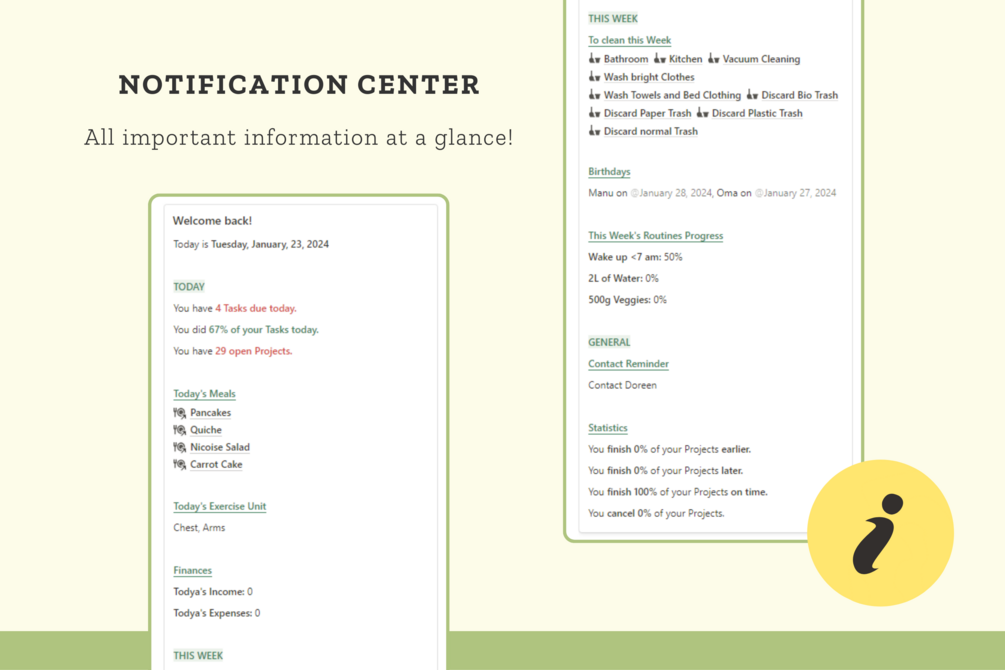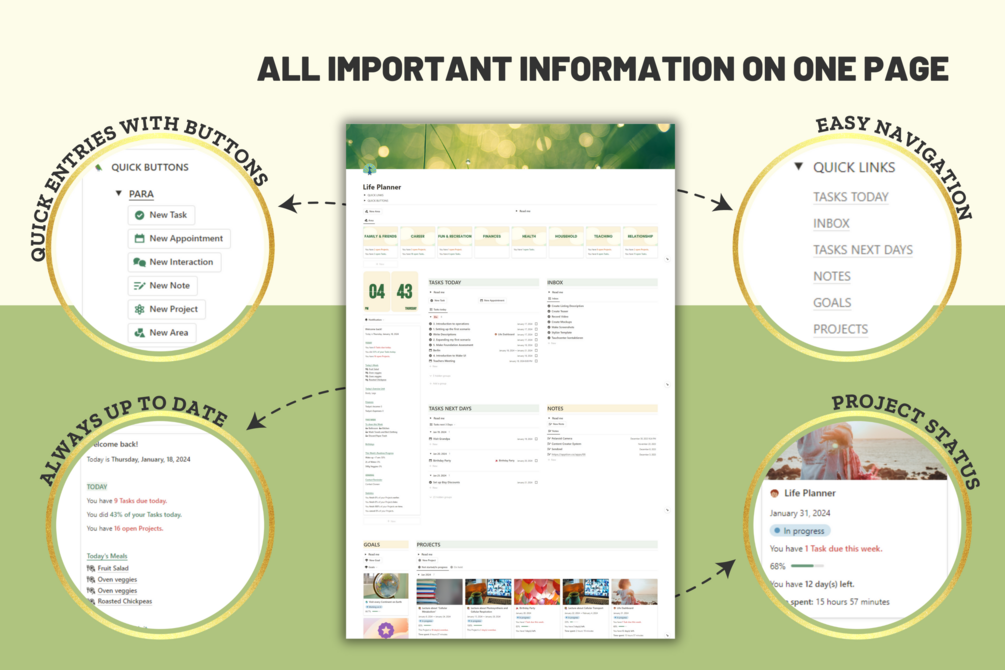 The Life Planner is more than just a template; it's a lifestyle enhancer. It's built to offer you a unified platform for managing diverse life areas. Perfect for those looking to streamline tasks, set and achieve goals, oversee finances, organize vacations, monitor health, and indulge in entertainment. Itโs your one-stop solution for boosting productivity and nurturing well-being.