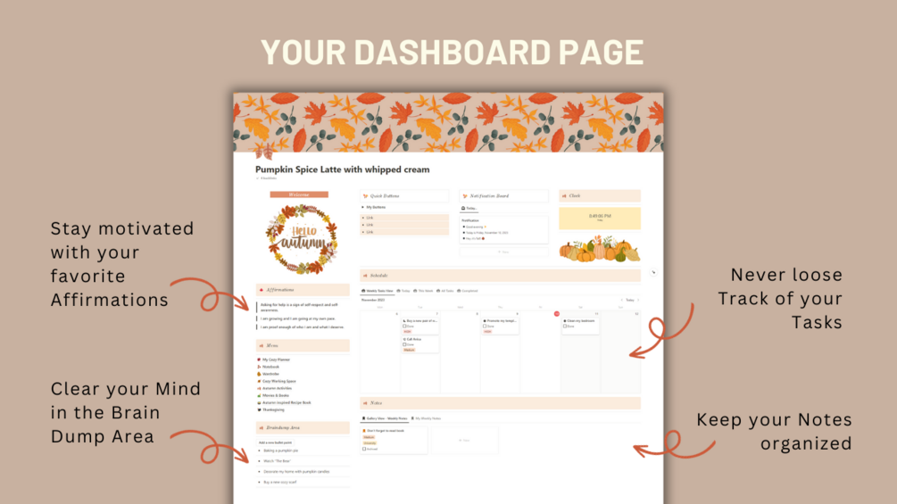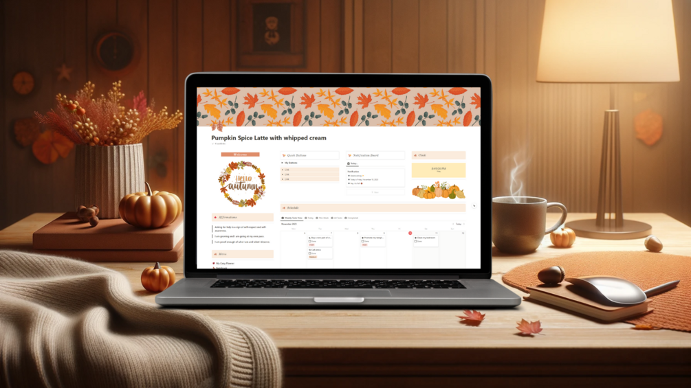 Imagine diving into your day with the comforting embrace of a Pumpkin Spice Latte. Now, envision that same cozy warmth infusing your workspace through the Pumpkin Spice Latte-inspired magic of our Cozy Autumn Template for Notion!