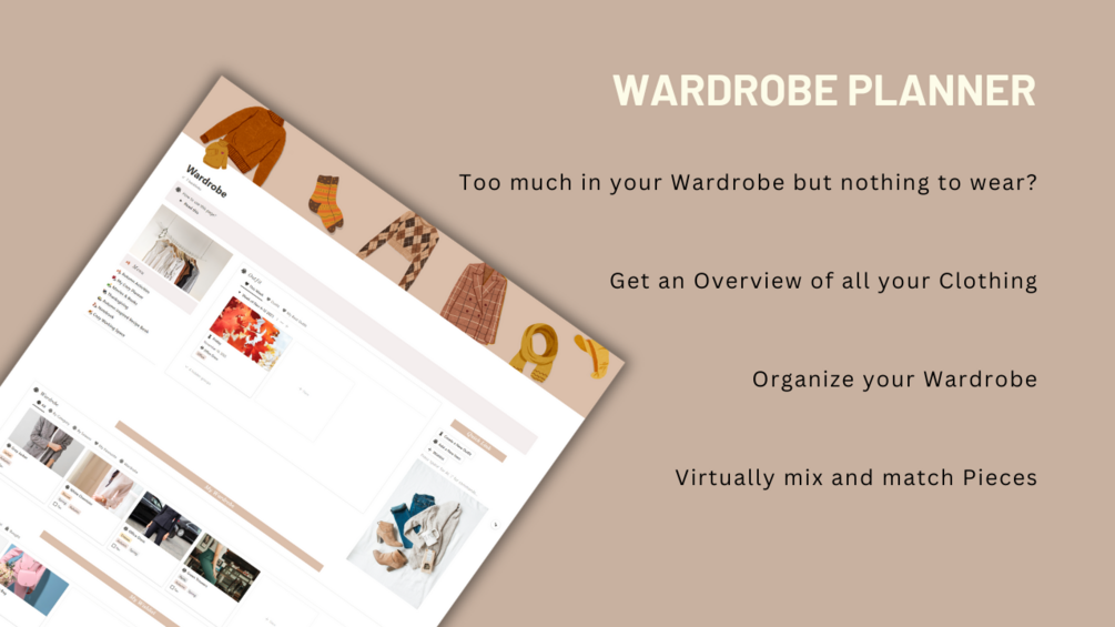 • Wardrobe: your virtual fashion haven for curating, organizing, and planning your daily and special outfits. This Notion page is designed to simplify your daily dressing routine, spark your creativity, and keep your wardrobe in check.