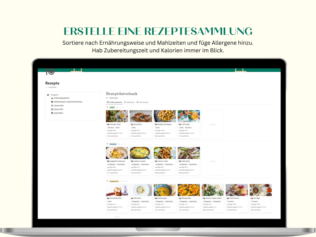 ✨ Rezepte ohne Ende: Schluss mit dem Chaos beim Sammeln von Rezepten! Im Notion Ernährungstagebuch kannst du all deine Lieblingsgerichte, von leckeren Smoothie-Bowls bis hin zu herzhaften Salaten, speichern. Du kannst die Rezepte nach Ernährungsart, Mahlzeiten und potenziellen Allergenen markieren und sortieren. So behältst du all deine kulinarischen Abenteuer an einem Ort im Blick.