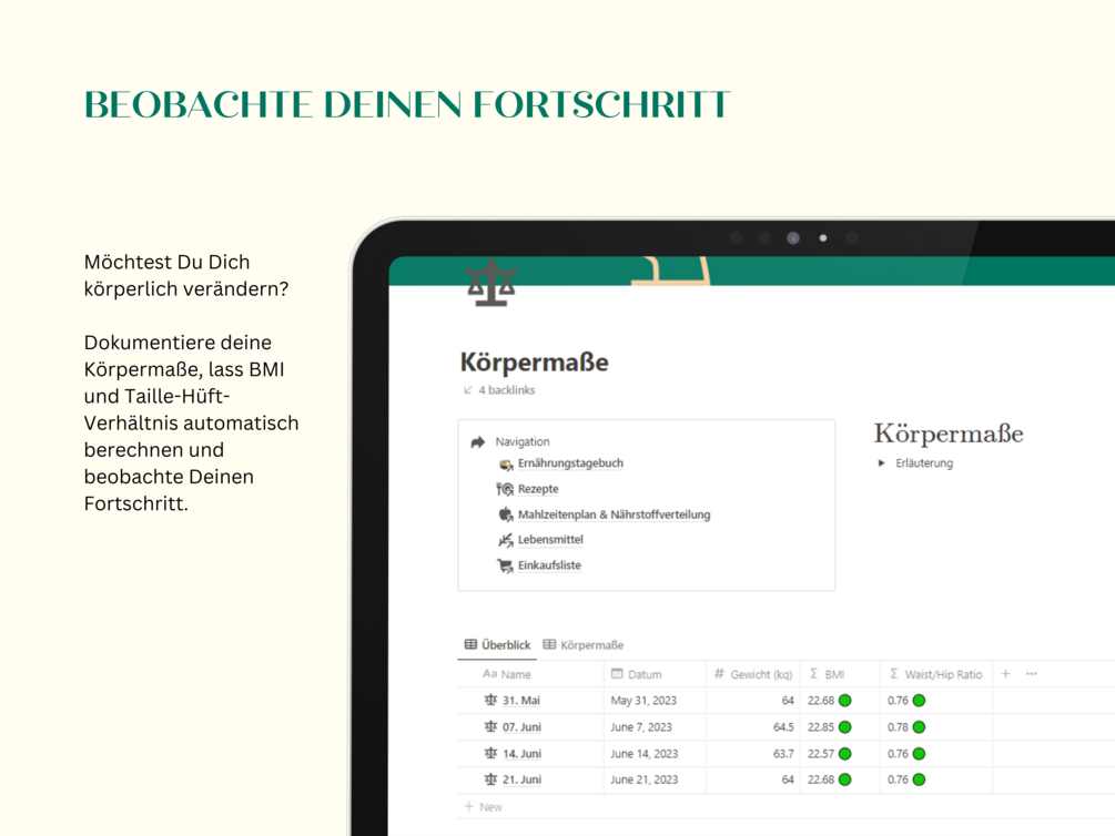 ✨ Körpermaß-Tracker: Es geht nicht nur darum, was du isst, sondern auch darum, wie du dich in deinem Körper fühlst. Mit diesem coolen Template kannst du deine Körpermaße wie Gewicht, BMI und Taillen-/Hüftverhältnis verfolgen. So kannst du deine Fortschritte messen und deine Erfolge gebührend feiern.