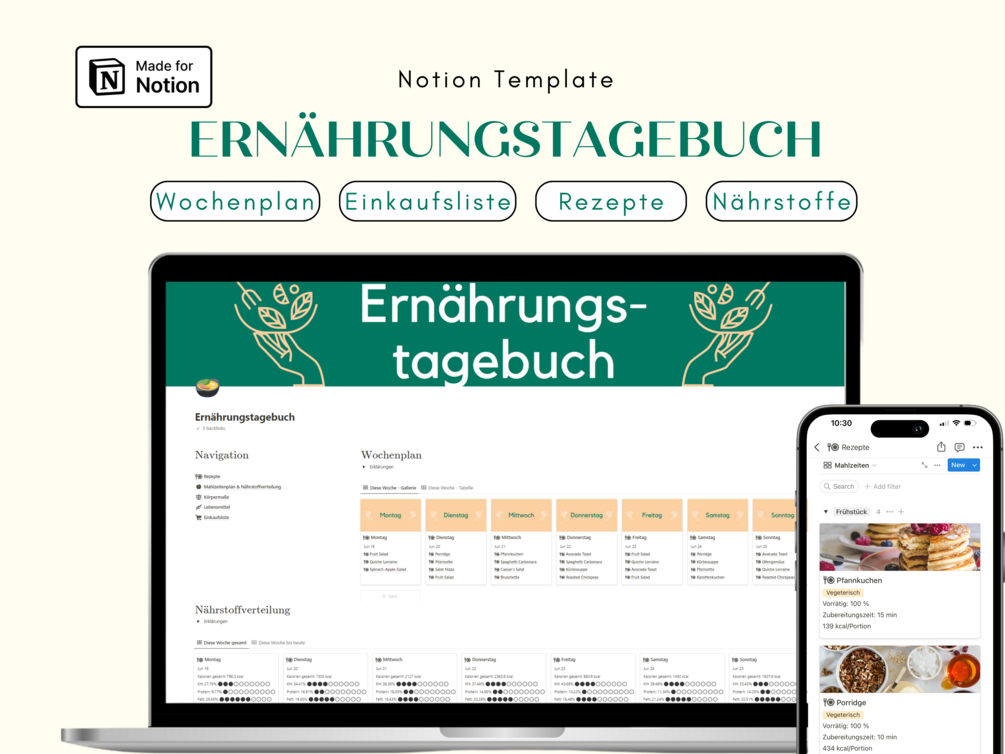 Notion ist die perfekte Plattform für das Ernährungstagebuch, denn es ist eine kostenlose All-in-One-Software, die auf verschiedenen Geräten verwendet werden kann. Was du auf einem Gerät änderst, wird automatisch auf allen anderen Geräten synchronisiert. Nutze die vielseitigen Funktionen von Notion, um deine Ernährung, Speisepläne, Rezepte und vieles mehr mühelos an einem praktischen Ort zu verfolgen und zu verwalten. Das beste daran: Du kannst von überall aus darauf zugreifen! Egal, ob du zu Hause oder unterwegs bist - du hast Dein Ernährungstagebuch immer bei dir! Es war noch nie so einfach, gesund zu leben!