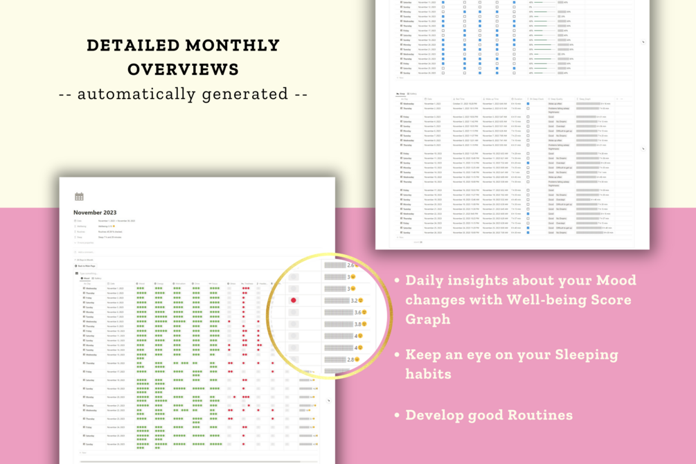 • Sorted Overviews: Quickly retrieve the information you need with sorted overviews. With well-organized and easily navigable sections, you can locate specific data, such as Mood Score trends, routine completion rates, or changes in sleep patterns (in Advanced versions), effortlessly. Spend less time searching and more time focusing on your personal growth.