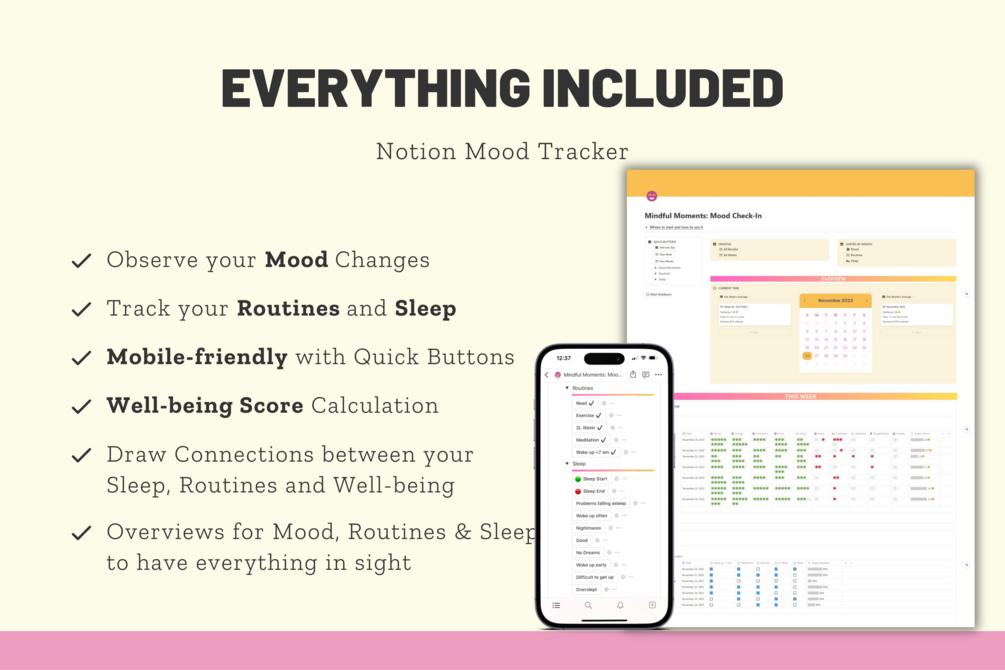 • Mood Tracker with Mood Score: Gain a deeper understanding of your emotional well-being through the Mood Tracker. Log your daily moods and watch as the template calculates your Wellbeing Score, offering a tangible representation of your overall emotional state.